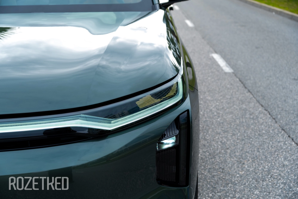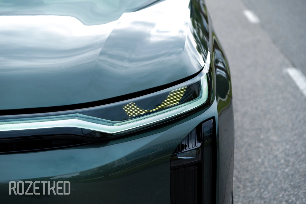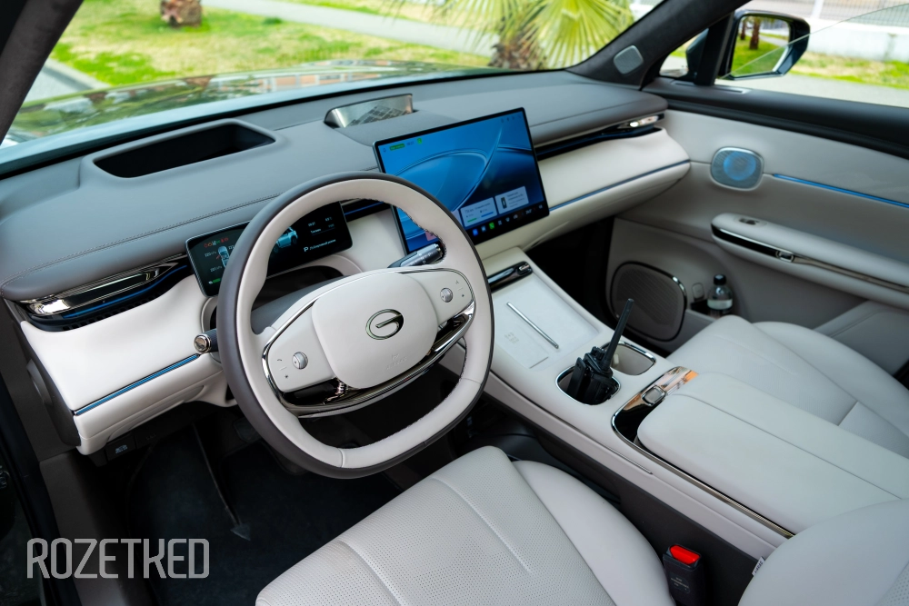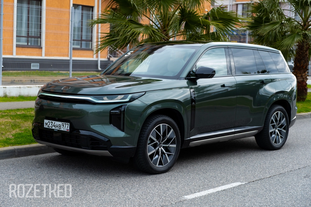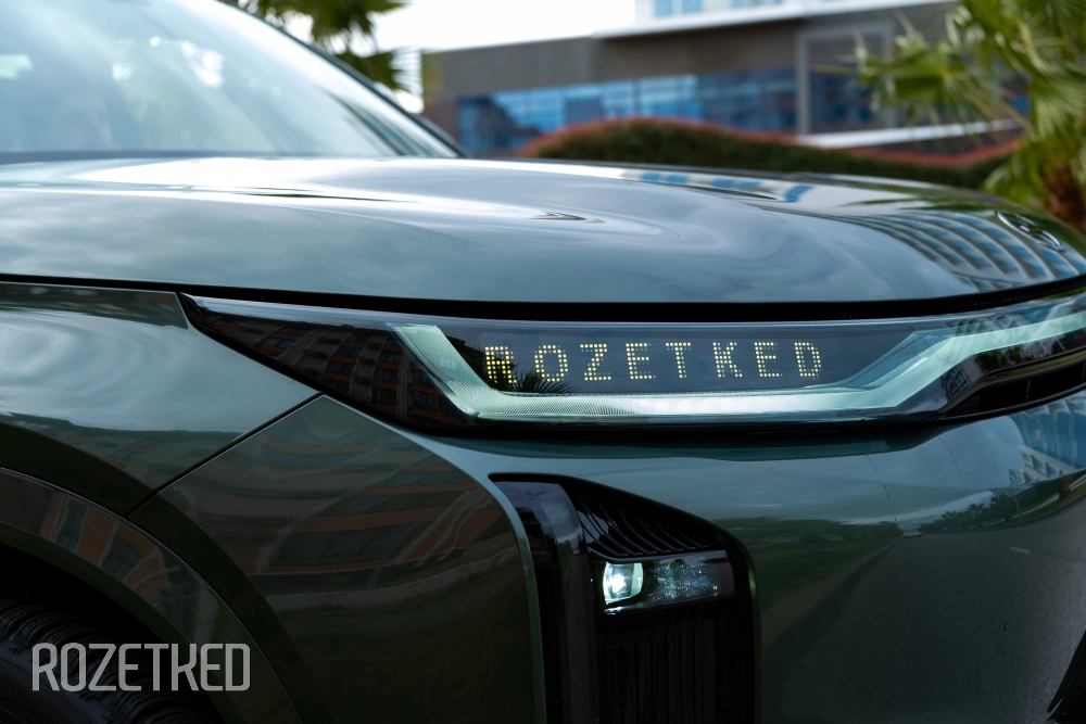 Самая заметная деталь в экстерьере — это светодиодная полоса вдоль передней части, которая по краям перетекает в секции фар. От сравнений с Li Xiang никуда не деться, но, на мой взгляд, у GAC получилось дистанцироваться максимально эффектно: они просто добавили привычные фары со светодиодной оптикой. По сути — «глаза», которыми автомобиль периодически «стреляет» по сторонам.