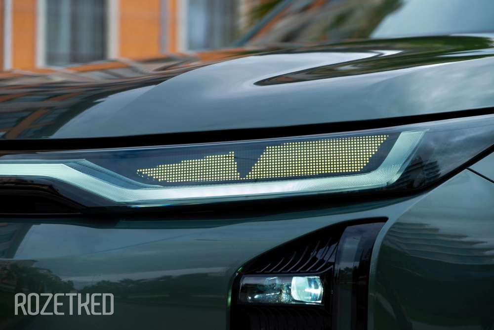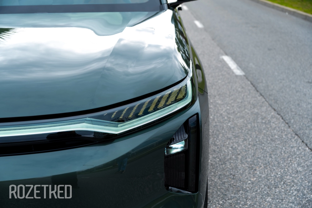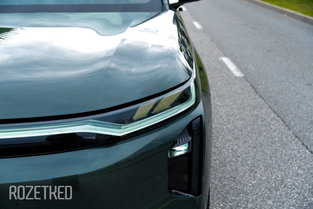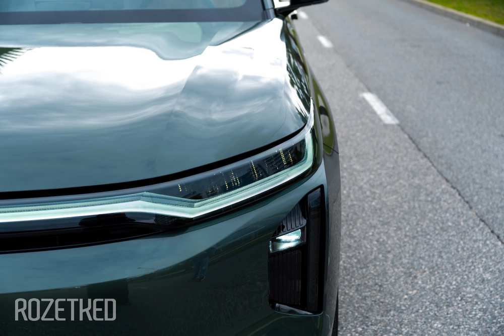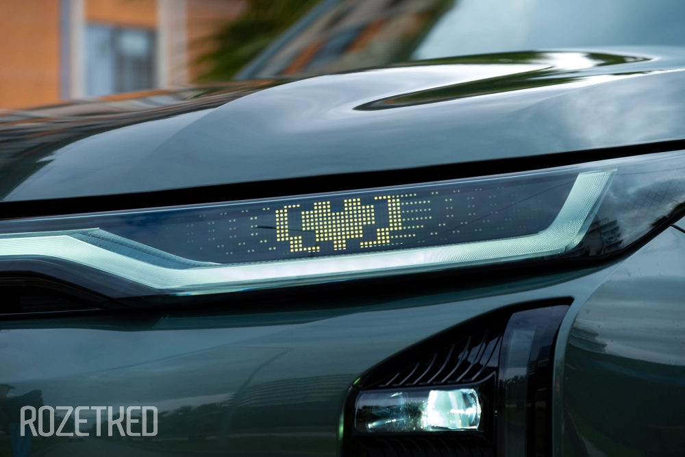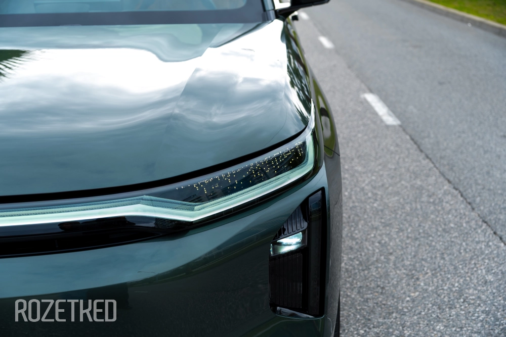 Самая заметная деталь в экстерьере — это светодиодная полоса вдоль передней части, которая по краям перетекает в секции фар. От сравнений с Li Xiang никуда не деться, но, на мой взгляд, у GAC получилось дистанцироваться максимально эффектно: они просто добавили привычные фары со светодиодной оптикой. По сути — «глаза», которыми автомобиль периодически «стреляет» по сторонам.