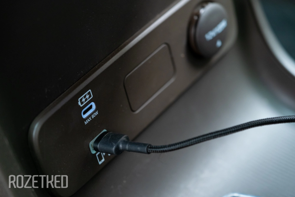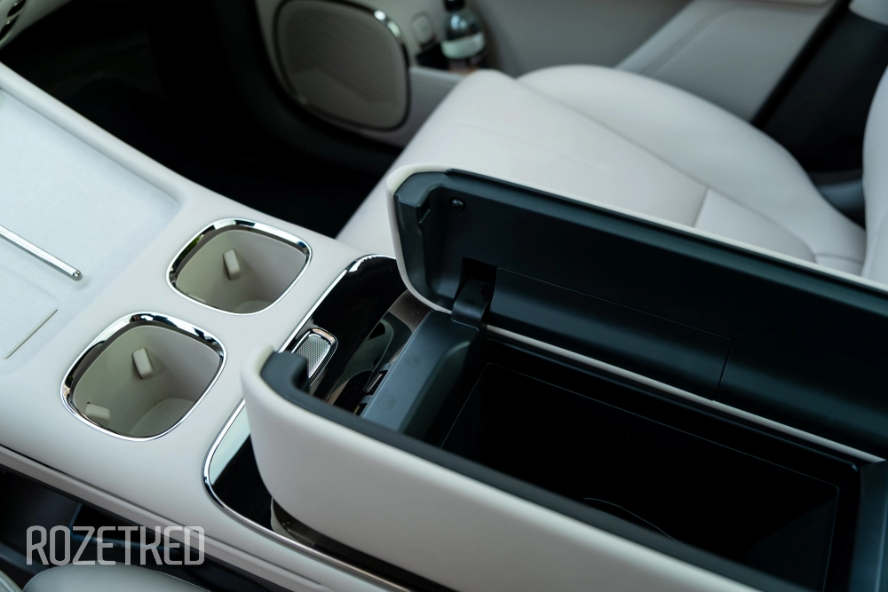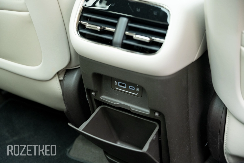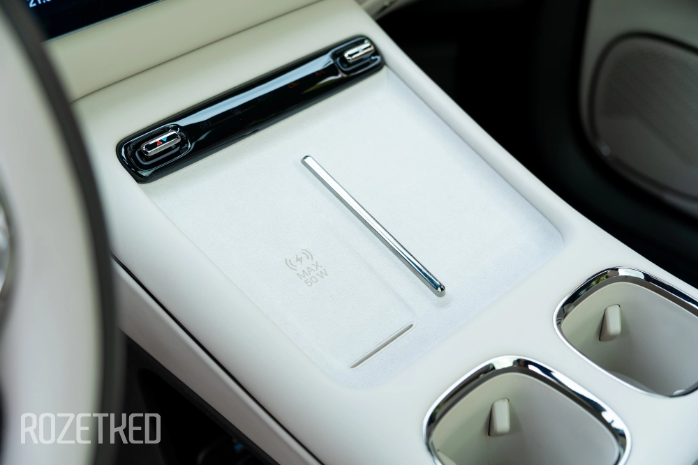 Под экраном расположен мягкий постамент с беспроводной зарядкой для смартфона на 50 Вт — только со стороны водителя. Для переднего пассажира — снизу припрятаны порты USB-C и USB-A (для задних пассажиров такой же набор). Спереди ещё есть автомобильная розетка.