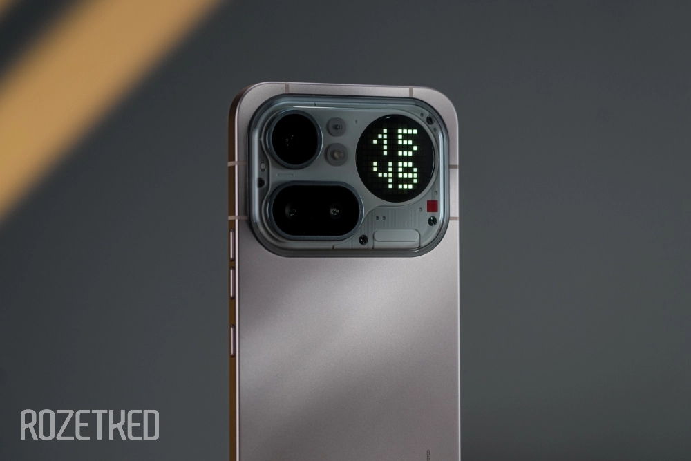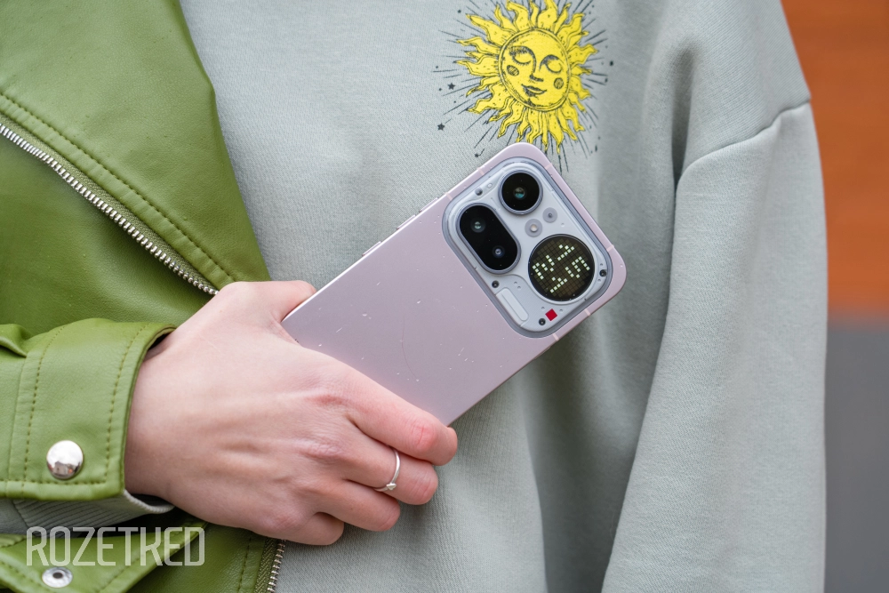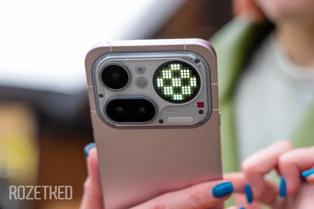 Сбоку от трёх камер расположился экранчик Glyph Matrix, как в Phone (3). Его сделали заметно больше, чем в прошлогоднем флагмане, но разрешение при этом понизили — точек меньше. Хотя на всё хватает.