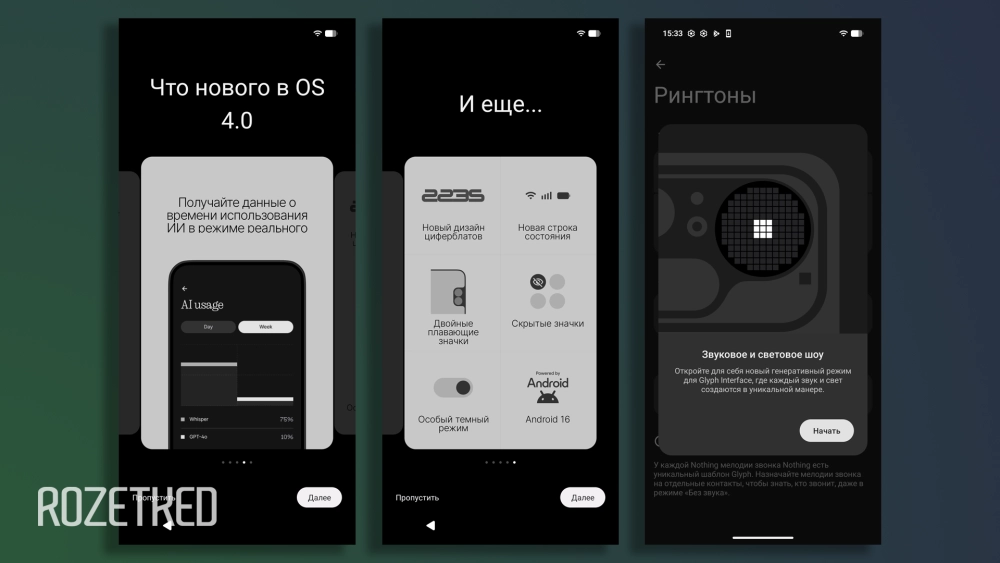 Ну и хорошая новость — в системе практически нет ИИ-фишек. Если вы устали от вездесущего AI, который ещё в 90% случаев не работает на русском, то можете считать, что Nothing OS — ваше спасение.