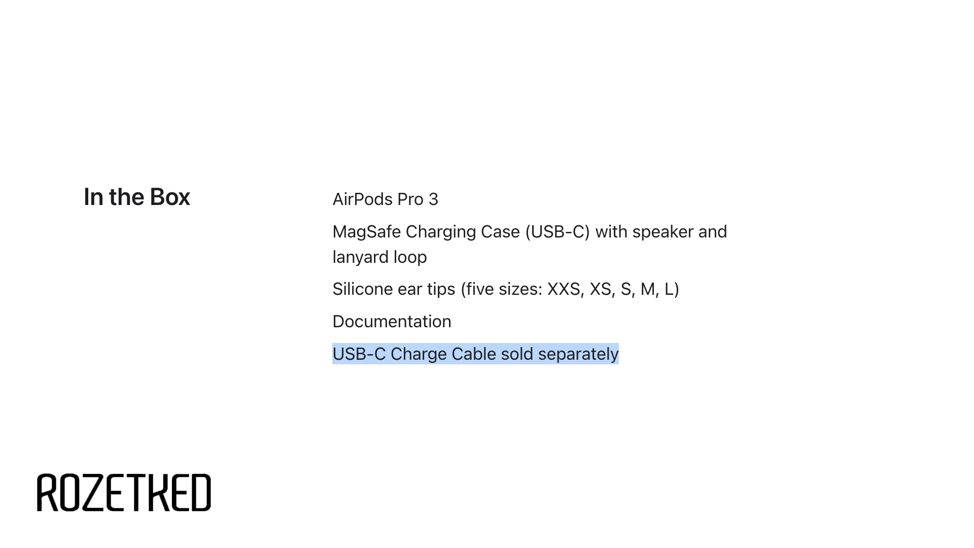 Apple не положила зарядный кабель в комплект AirPods Pro 3 — информация об этом есть на сайте компании. В коробке с AirPods Pro 3 идут зарядный кейс, пять амбушюр разных размеров и документация.