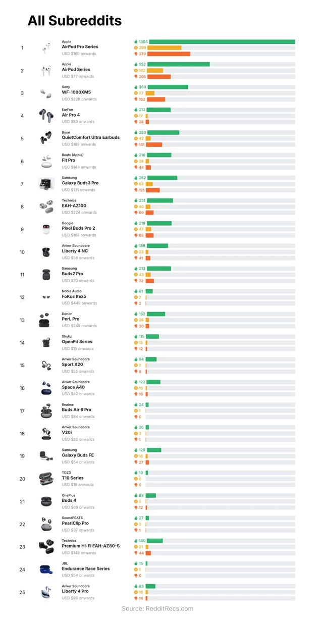 Также в рейтинге нашлось место для Sony WF-1000XM5, Soundcore Liberty 4 и флагманских наушников от Bose. Анализ шёл по двум направлениям: сабреддит, посвящённый наушникам, и весь Reddit целиком. Всего было проанализировано около 13 тысяч ответов пользователей.