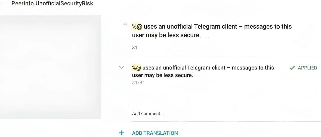 В коде iOS-версии мессенджера обнаружили строку PeerInfo.UnofficialSecurityRisk. Она отвечает за предупреждение о том, что собеседник использует стороннее приложение, из-за чего переписка может быть менее безопасной.